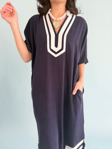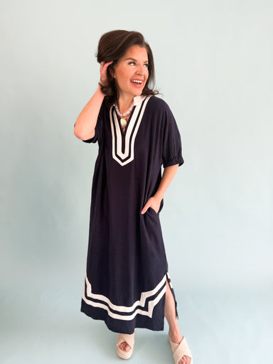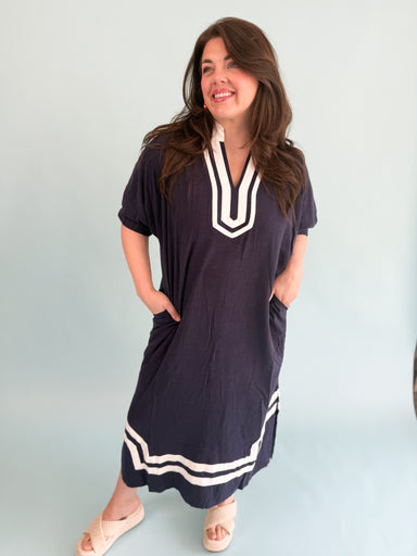 The Belle Haven Dress features a classic navy and white color scheme, providing a timeless aesthetic suitable for various occasions. Its comfortabl...