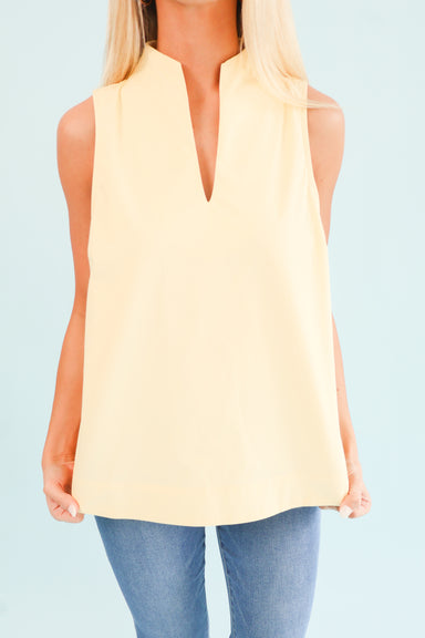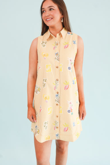 Brighten your wardrobe with this charming sleeveless top featuring bold yellow stripes paired with a delicate floral graphic. The convenient button...