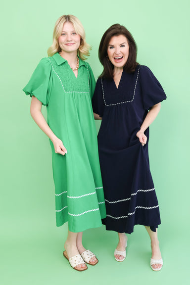 Elevate your everyday style with this midi dress featuring delicate ribbon trim detailing and signature puff sleeves. The forgiving fit offers all-...