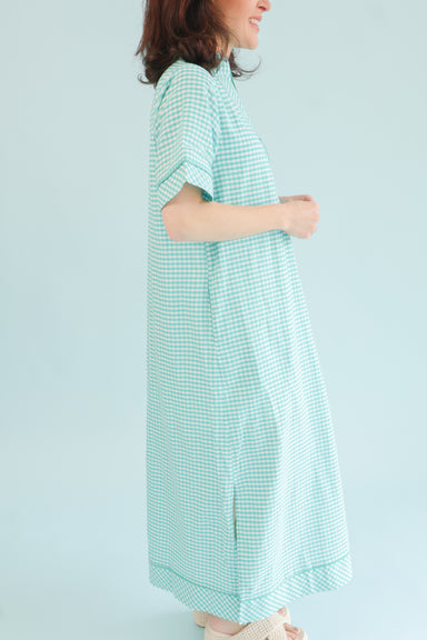 Elevate your wardrobe with this timeless Derby Day Dress, featuring a charming turquoise and white gingham pattern that captures classic Southern e...