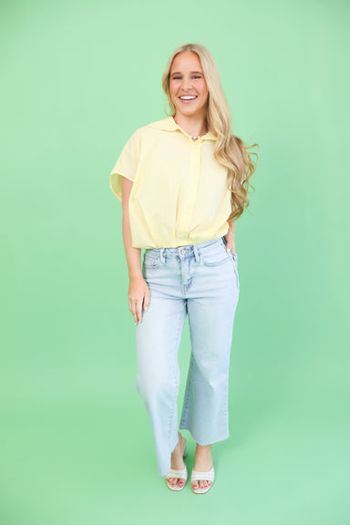 Effortless elegance meets warm sunshine in this butter yellow button-up top. The playful bubble hem adds dimension and movement, while the lightwei...