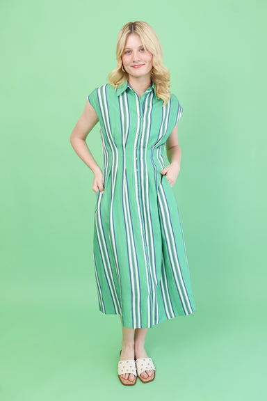 Elevate your everyday style with the Stripe Society Dress, a timeless midi featuring crisp vertical stripes in rich green tones. The button-front d...