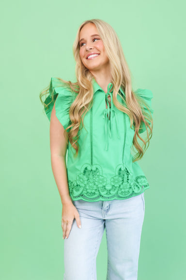 Elevate your spring wardrobe with this charming green top, designed with delicate flutter sleeves that add movement and elegance to any look. Perfe...