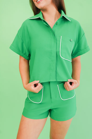 Elevate your everyday wardrobe with this sophisticated co-ord set in rich kelly green accented with crisp white piping. The tailored silhouette fla...