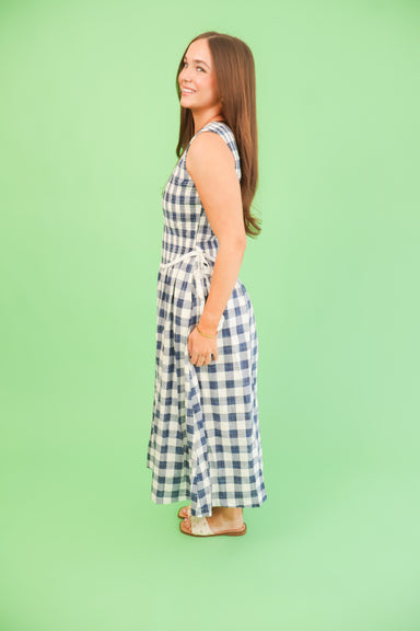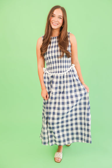 Effortless charm meets timeless style with the Sunday Picnic Dress. This sleeveless midi features a classic navy and white gingham pattern that's p...