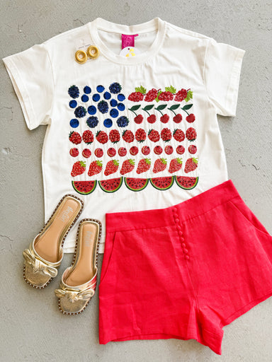 Celebrate your patriotic spirit in style with the Queen of Sparkles Fruit Flag Tee. This festive design features vibrant fruit imagery woven into a...
