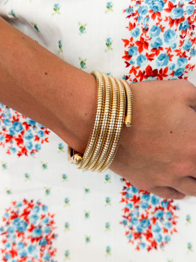 Elevate your wrist with this stunning gold statement bracelet. The flexible coil snake design wraps gracefully around your arm, delivering bold sty...