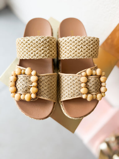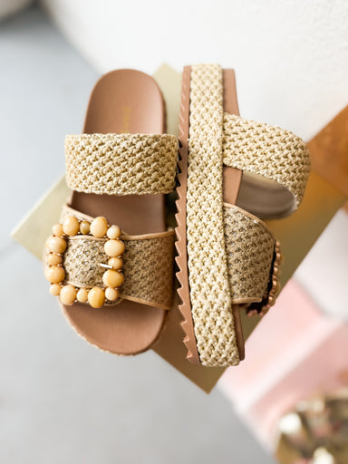 Effortless summer style meets everyday comfort in this beige raffia platform slide. The natural woven texture brings a relaxed, coastal vibe to any...