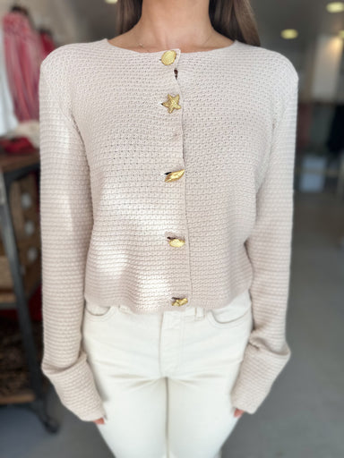 Elevate your wardrobe with the Shoreline Button Cardigan, featuring stunning gold statement buttons that catch the light with every movement. This ...