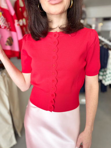 Elevate your date night wardrobe with this stunning Scallop Knit Cardigan in rich red. Delicately crafted with charming scalloped detailing, this p...