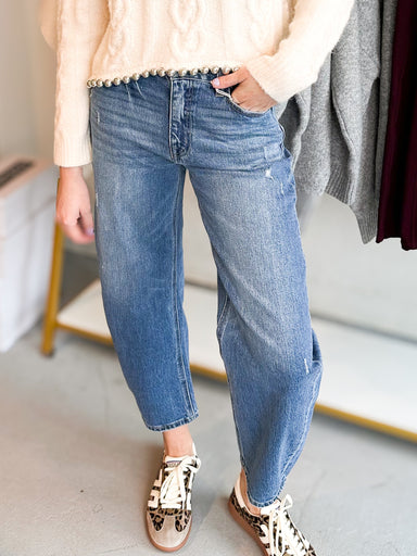 These High Rise Barrel Denim jeans are a must-have for any fashion-forward individual. With a medium wash, they are versatile and can be dressed up...