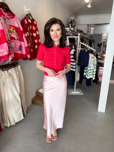 The Aniston Slip Skirt effortlessly transitions from day to night with its silky satin finish and flattering midi length. This versatile piece laye...