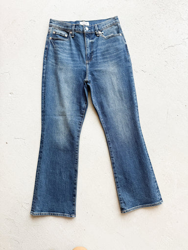 The Sunset Flare is a high rise flared jean in a versatile medium wash. This flattering fit hugs you at the waist and flares dramatically from knee...