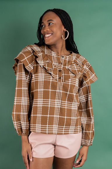 The Plaid Ruffle Top combines classic patterns with feminine detailing, making it an ideal choice for transitional seasons. Its long sleeves provid...